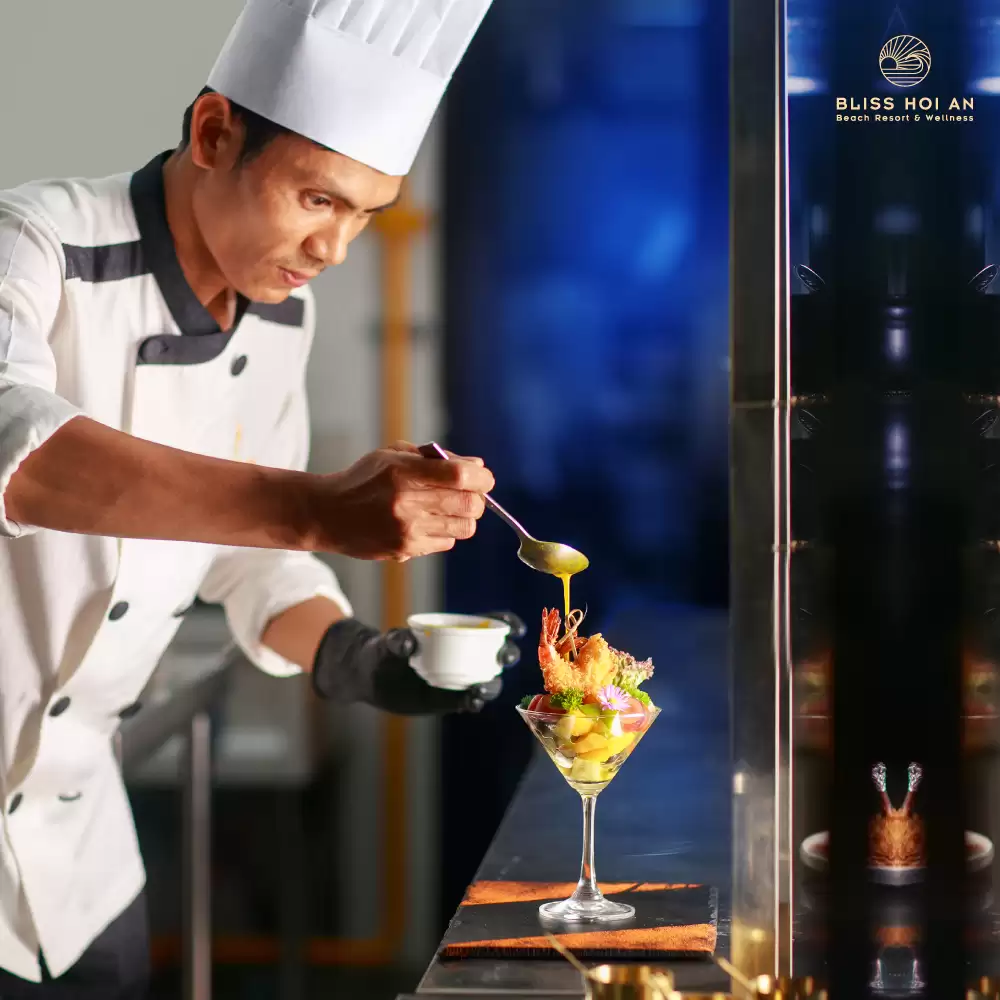 존경받는 셰프가 이끄는 이 리조트의 요리팀은 미뢰를 자극하고 오래도록 기억에 남는 요리 걸작을 만드는 데 중심이 됩니다. 호화로운 뷔페, 고급 앉아서 먹는 저녁 식사, 커피 브레이크 동안의 상쾌한 다과 등 Bliss Hoi An의 요리 예술은 현지 풍미와 국제적인 영향을 완벽하게 혼합하여 가장 안목 있는 미각을 가진 사람도 기쁘게 할 풍미의 교향곡을 만들어냅니다.