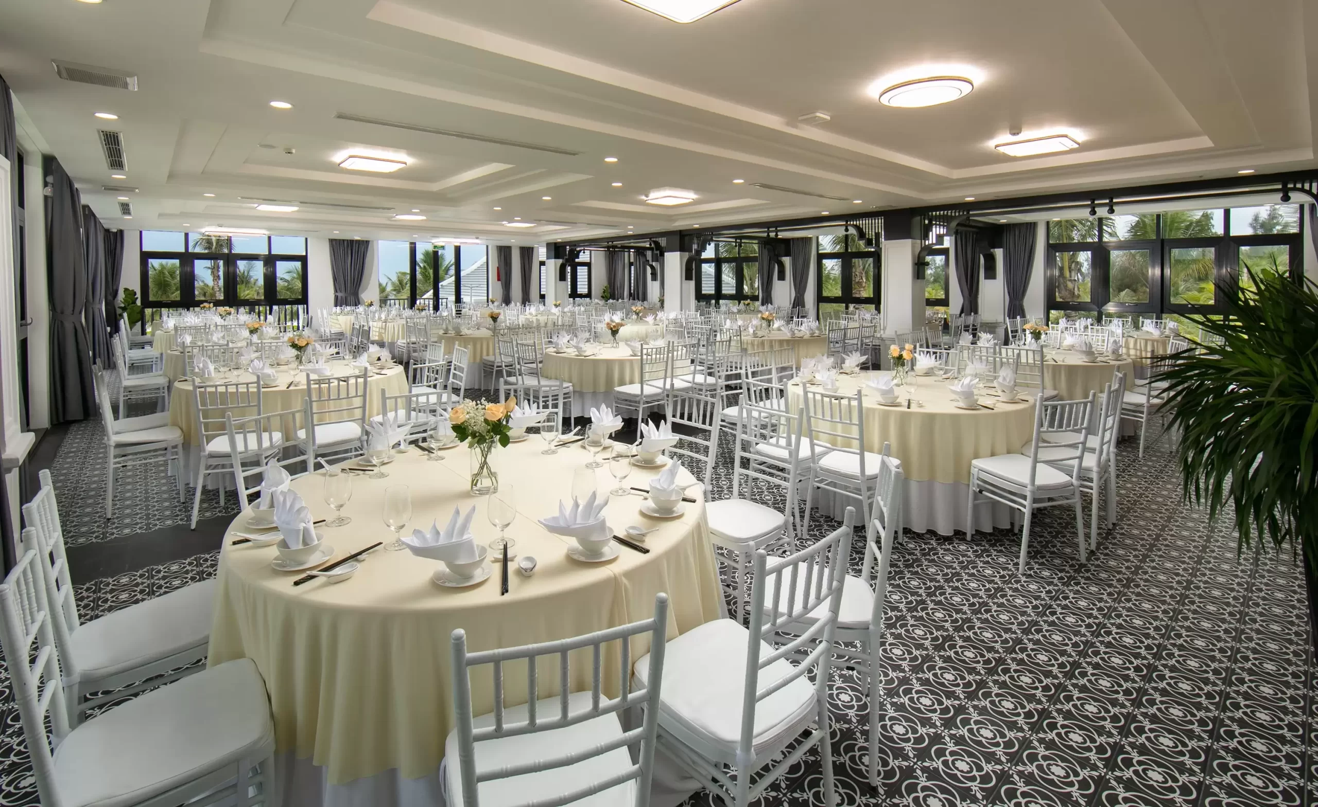 Bliss Hoi An의 하이라이트 중 하나는 Thang Binh Ballroom입니다. 리조트가 위치한 땅의 이름을 딴 이 절묘한 볼룸은 세련된 세련미와 뛰어난 우아함을 결합합니다. 이 장소에 들어서면 우아한 흑백 톤이 매혹적인 분위기를 조성하여 시대를 초월한 매력의 세계가 여러분을 맞이합니다.
